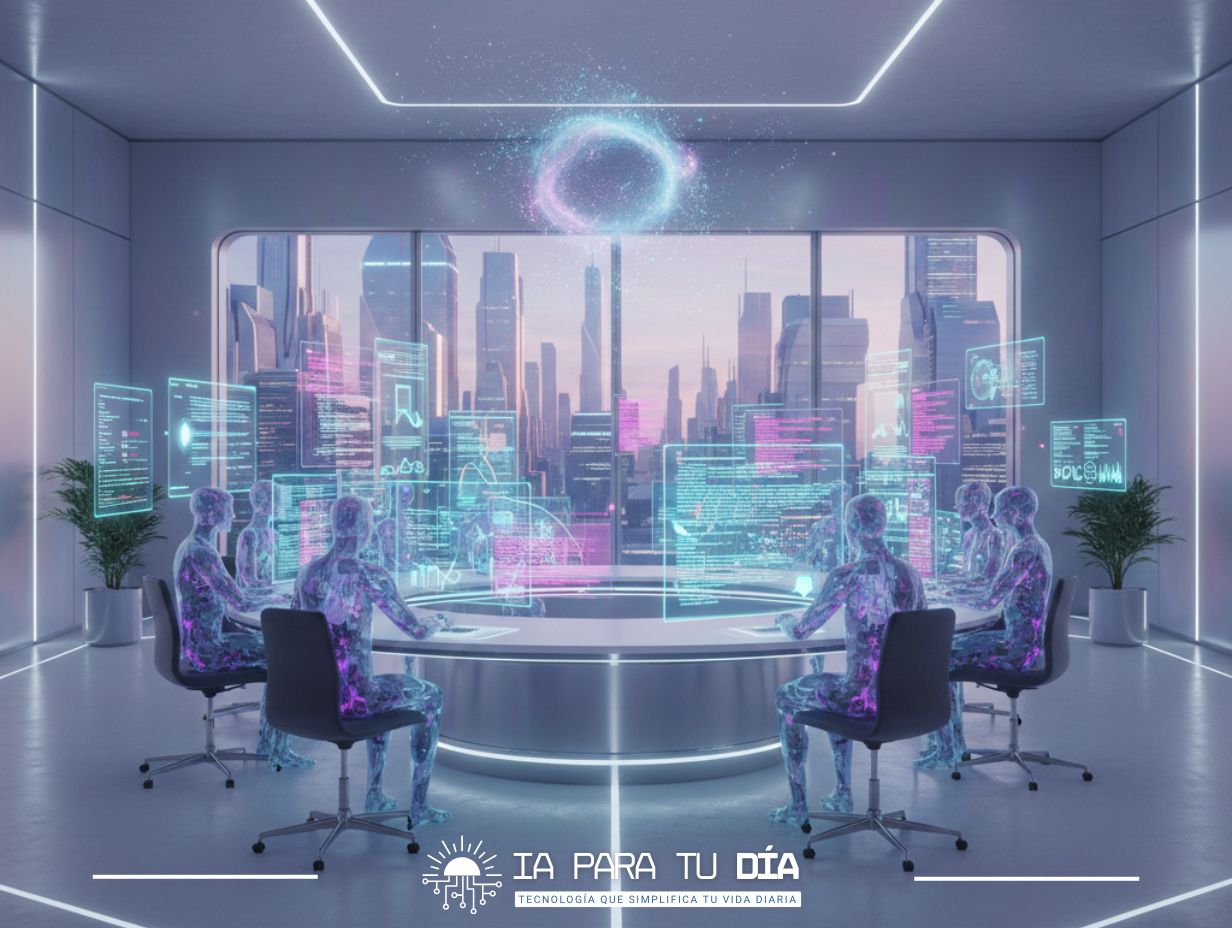 Hoy no es un día normal en IA. Es el día en que dos de las empresas más poderosas del mundo lanzaron modelos que pueden mejorarse a sí mismos y trabajar en equipos. Necesitamos una imagen que capture esa sensación de "equipo de IA" trabajando juntos, como si fueran humanos en una oficina futurista, pero con un toque de ciencia ficción que nos recuerde que esto antes era imposible.