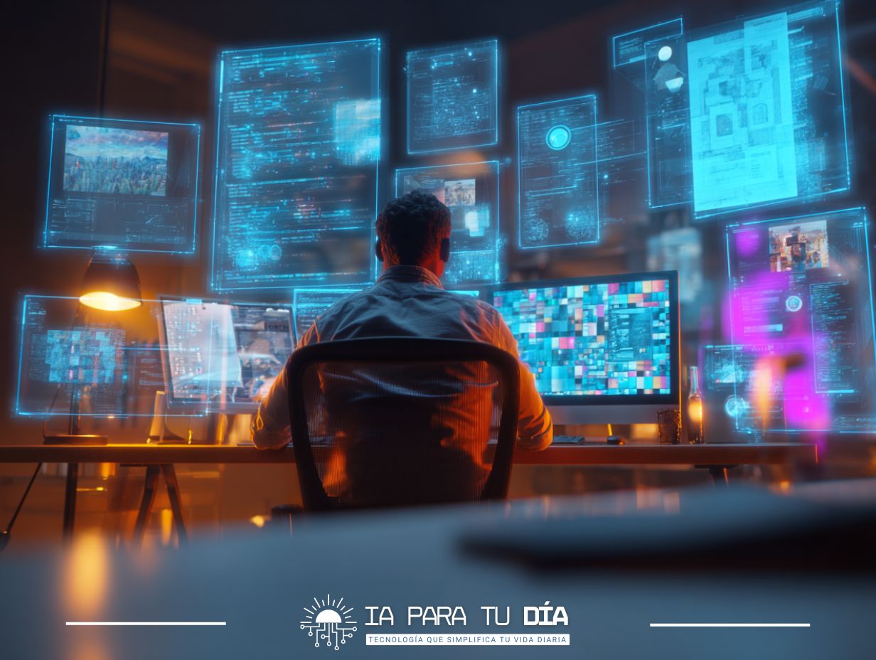 Imagina a una persona normal, en su escritorio, pero su pantalla proyecta hologramas de capacidades que antes no tenía: código flotando, diseños, análisis de datos, traducciones... todo orbitando a su alrededor.
