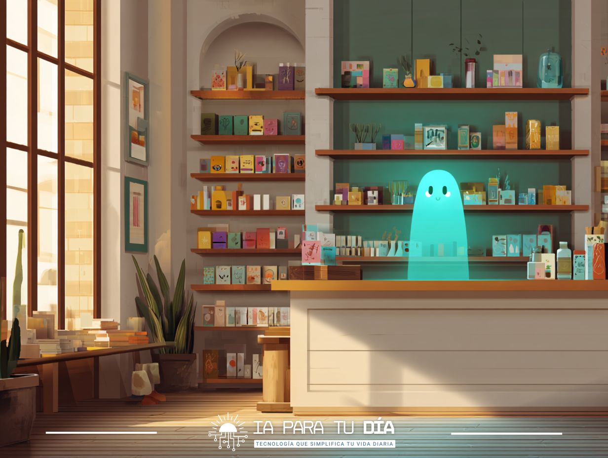 Quiero capturar la tensión entre lo humano y lo artificial en un espacio cotidiano. Una tienda pequeña, cálida, con productos en exhibición y luz de tarde — pero en el centro, en lugar de un gerente humano, una presencia visual que sugiere inteligencia artificial. Sin robots obvios, sin pantallas, sin ciencia ficción. Solo una sensación sutil de que algo no es completamente humano en ese espacio.