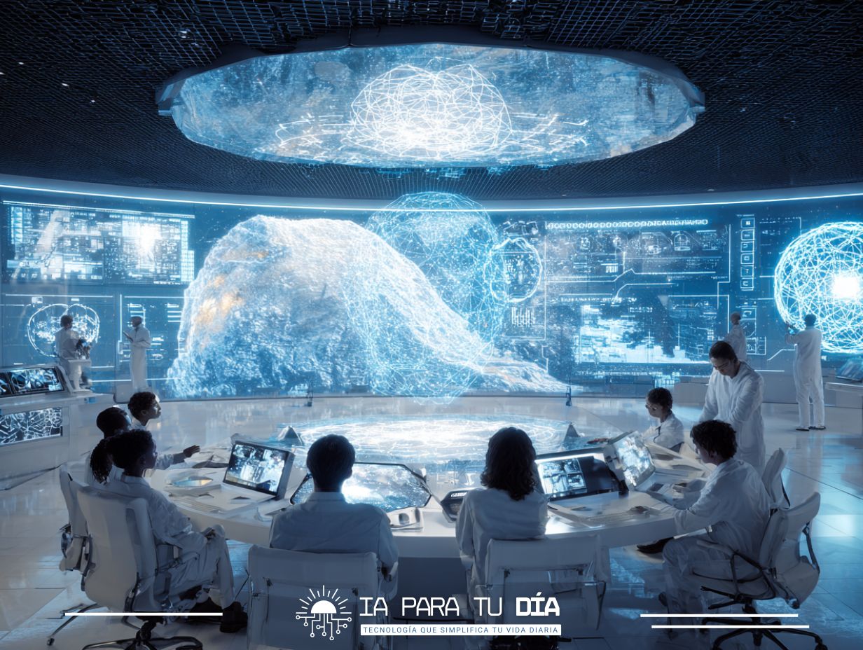 Imagina un centro de comando futurista donde científicos y sistemas de IA trabajan lado a lado, con hologramas mostrando descubrimientos en energía, medicina y materiales nuevos. No es ciencia ficción distópica—es ciencia ficción inspiradora.